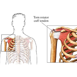 Initial treatment of a torn rotator cuff should be taking a non steroidal anti inflammatory medication to reduce the pain and inflammation. Ice packs should be administered for 20 minutes, 4-6 times per day for the first several days. Afterwards, a heat pack or warm soaked towel can be used to massage the shoulder area to loosen the muscles. A professional diagnosis is needed to determine the severity of the injury and advanced treatment options.